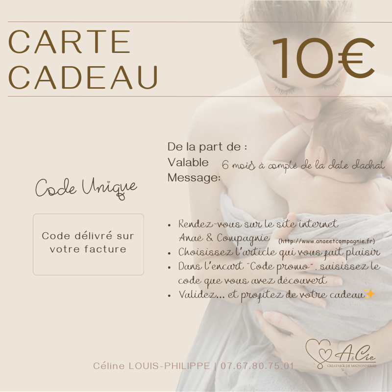 La Carte cadeau Anaë & Compagnie – 10 € est le cadeau idéal pour toutes les occasions : naissance, anniversaire, fêtes ou simplement pour faire plaisir.