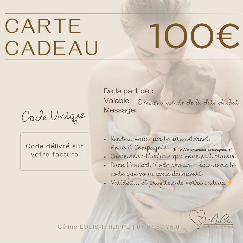 Offrez une carte cadeau bébé 100 € Anaë & Compagnie, parfaite pour une naissance, un baptême ou un anniversaire.