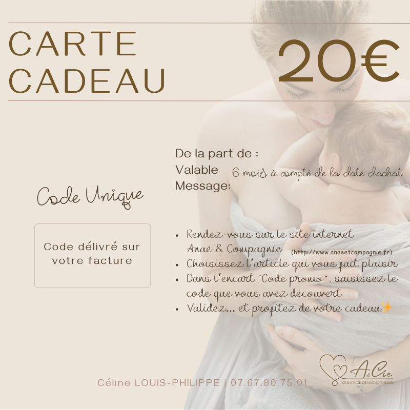 Offrez une carte cadeau bébé 20 € Anaë & Compagnie, idéale pour une naissance, un baptême ou un anniversaire.