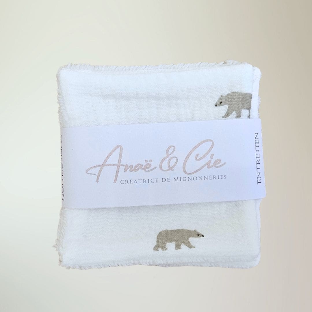 Lot de 7 cotons lavables bébé en double gaze blanc cassé avec motifs petits ours polaires gris, et éponge de bambou certifiée. Doux, absorbants et réutilisables, parfaits pour bébé et maman.