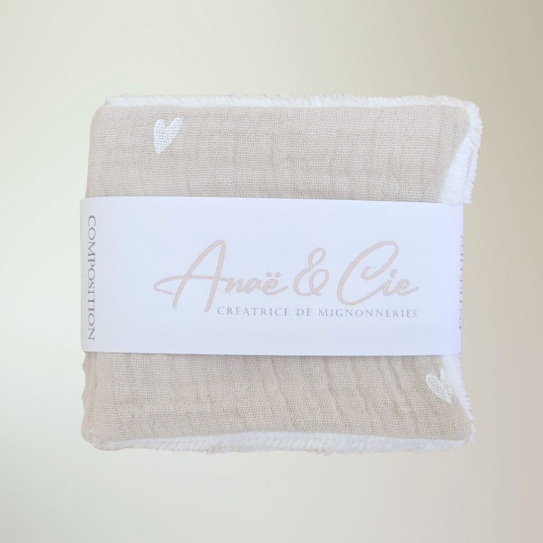 Lot de 7 cotons lavables bébé en double gaze beige avec petits cœurs blancs, et éponge de bambou certifiée. Doux, absorbants et réutilisables, parfaits pour bébé et maman.