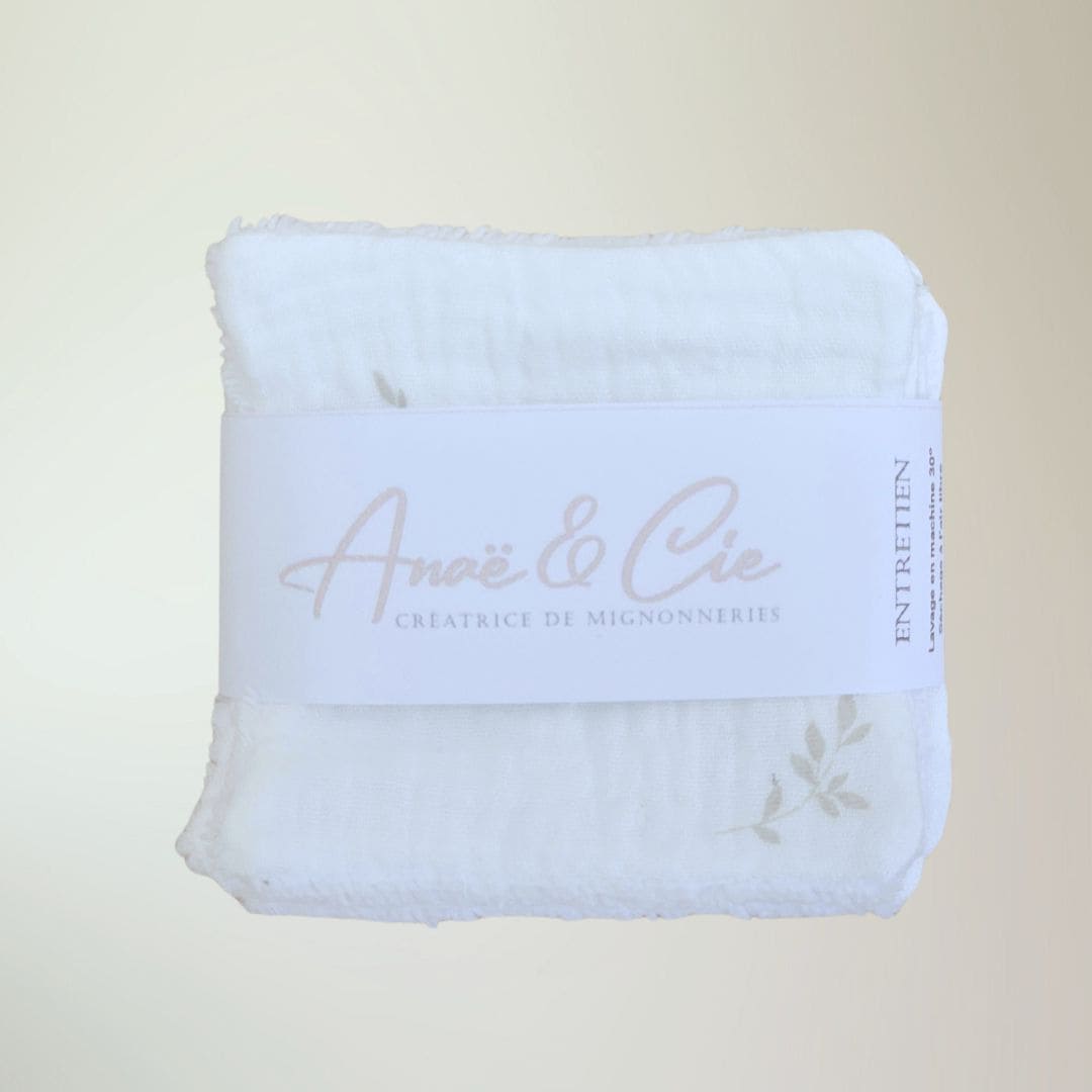 Lot de 7 cotons lavables bébé en double gaze blanc cassé à petites fleurs brindilles greige, et éponge de bambou certifiée. Doux, absorbants et réutilisables, parfaits pour bébé et maman.