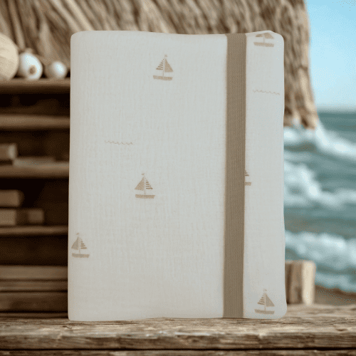 Protège carnet de santé Flot de Câlins ⛵ — un accessoire pratique et élégant en double gaze blanc cassé avec motif petits voiliers beige, idéal dès la naissance.