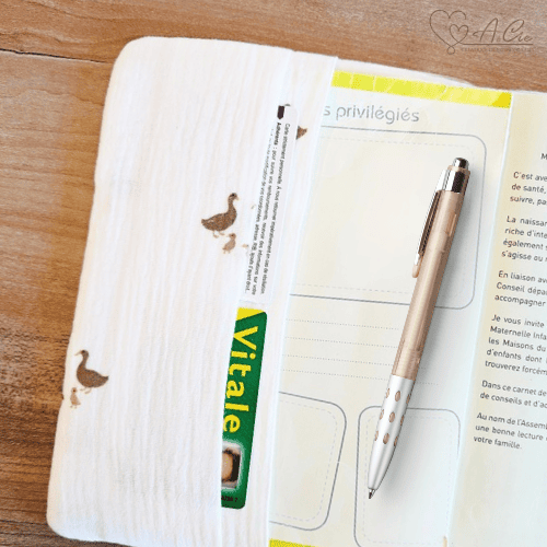 Protège carnet de santé personnalisable Sous les Ailes Douces 🕊️ — pratique et élégant en double gaze blanc cassé avec motifs oies, idéal dès la naissance.