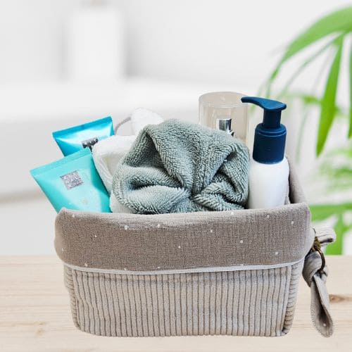 Trousse de toilette en velours côtelé gris – Doublure « Nuée de Tendresse »